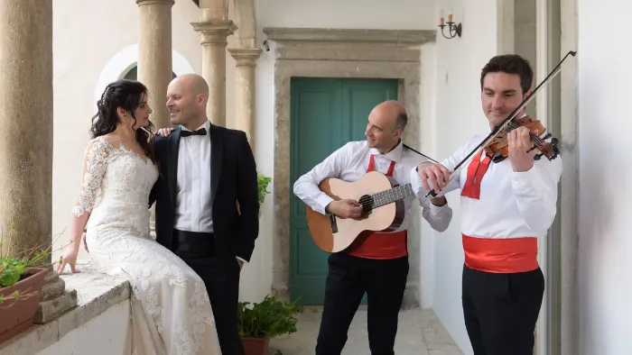 Durante il rito sia civile che religioso, in chiesa o in uno splendido giardino all'aperto, aggiunge un tocco di solennità e grazia con un accompagnamento musicale raffinato, che unisce la tradizione sacra all'anima profonda partenopea.